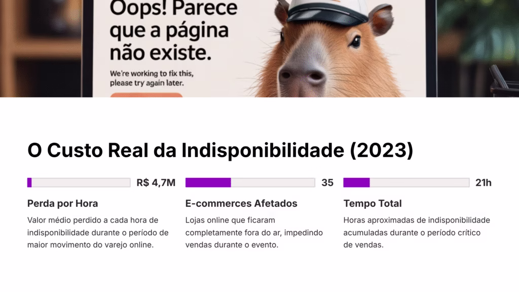 Durante o período de maior movimento do varejo online brasileiro, dados da Sofist revelam que cada hora de indisponibilidade representou perdas médias de R$ 4.734.193,52 em vendas. Um total de 35 e-commerces permaneceram fora do ar por aproximadamente 21 horas ao longo do evento, impedindo completamente que consumidores realizassem suas compras.